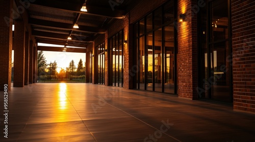 A serene indoor space featuring modern architecture, wooden beams, and warm lighting, highlighted by a stunning sunset view.