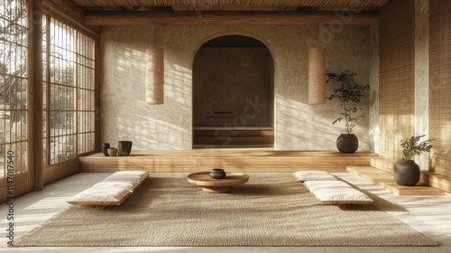 A serene indoor space with wooden decor, minimalistic furniture, and soft sunlight illuminating the earthy tones. Ideal for relaxation and wellness.