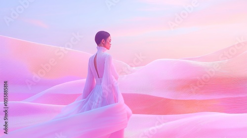 A serene journey through dreamy landscapes a woman in ethereal attire against a pastel horizon