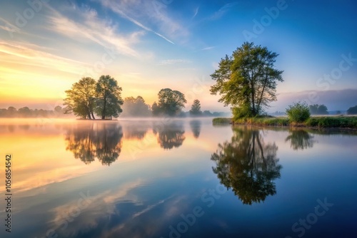 A serene lake at dawn with a misty atmosphere and a few trees surrounding the water's edge, nature photography, tranquility