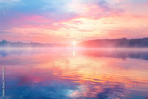 A serene lake at sunrise, featuring vibrant colors reflecting on the calm water, surrounded by mist and distant trees, creating a peaceful and tranquil atmosphere