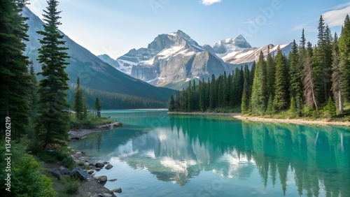 lake, mountain, water, landscape, nature, mountain, forest, snow, sky, canada, tree, park, scenic, banff, glacier, tree, travel, green, river, alberta, cloud, view, summer, outdoors