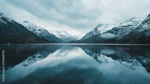 A serene lake reflects majestic mountains under cloudy sky