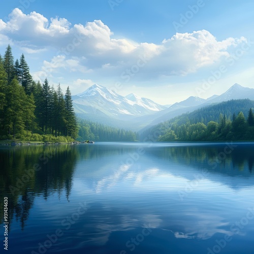 A serene lake reflects snow-capped mountains and lush pine trees under a bright blue sky, creating a tranquil nature scene ideal for travel promotions, outdoor adventure advertisements