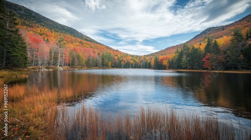 lake, autumn, tree, foliage, water, landscape, nature, sky, mountain, serenity, calmness, colours, scenery, outdoors, environment, peace, beauty, seasonal, wilderness, horizon, flora, fauna, calm, picturesque, park, hiking, adventure, exploration, relaxation, sunlight, cloud, vibrant, peaceful, scenic, rural, habitat, ecosystem, wildlife, journey, escape, natural, view, colours, vista, atmosphere