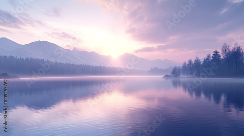 A serene landscape at dawn, featuring mountains, a calm lake, and soft pastel colors reflecting on the water's surface.