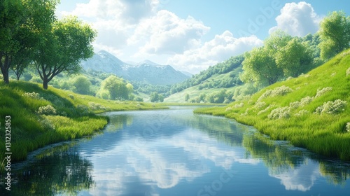 A serene landscape depicts a river flowing between green hills