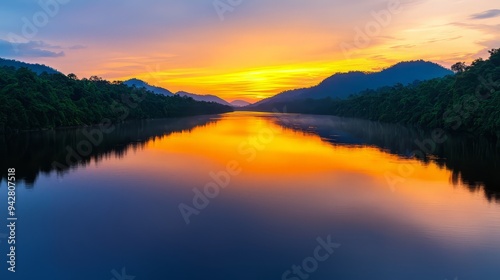 A serene landscape featuring a river reflecting a stunning sunset, surrounded by lush mountains and tranquil nature.