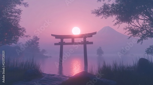 A serene landscape featuring a traditional torii gate at sunset, framed by misty mountains and calm waters, creating a tranquil atmosphere.