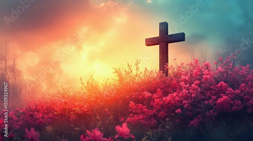 A serene landscape featuring a wooden cross amidst vibrant pink flowers and a stunning sunset sky, symbolizing peace and hope.