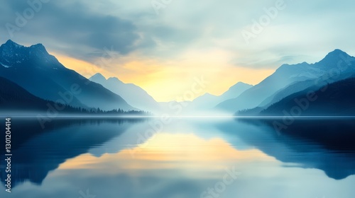 A serene landscape featuring misty mountains reflected in a calm lake at sunset, perfect for backgrounds, travel blogs, or relaxation themes, This tranquil scene evokes peace and contemplation,