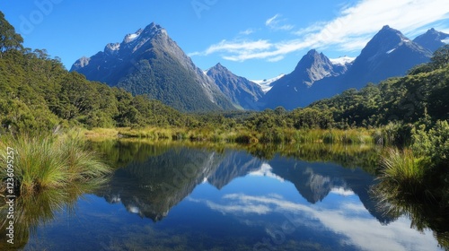 A serene landscape featuring mountains, a clear lake, and lush greenery under a blue sky.