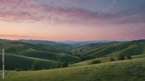 A Serene Landscape of Gentle Rolling Hills Bathed in Soft Pastel Colors at Sunset, Capturing the Tranquility and Beauty of Nature