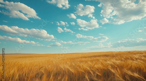 A serene landscape of golden wheat fields under a bright blue sky with fluffy clouds.