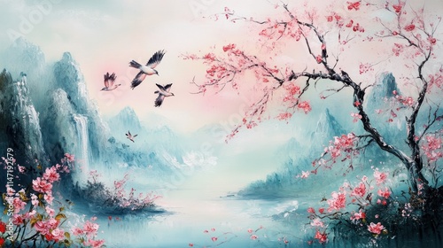 art, painting, landscape, mountain, mountain, nature, water, lake, sky, cloud, cloud, fog, mist, tree, tree branch, cherry blossom, cherry, blossom, flower, pink, bird, bird, flying, peaceful, serene, tranquil, beautiful, colourful, vibrant, abstract, abstract art, artwork, canvas, watercolor, oil painting, digital artwork, digital, illustration, graphic, graphic design
