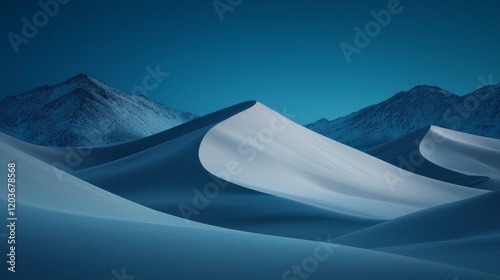 A serene landscape showcases smooth, undulating sand dunes bathed in cool blue tones, framed by distant mountains under a clear sky.