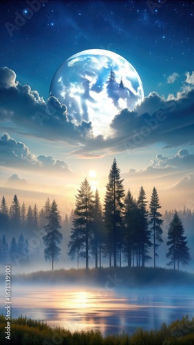 A serene landscape under a soft moonlit sky with gentle clouds and tall trees in the foreground
