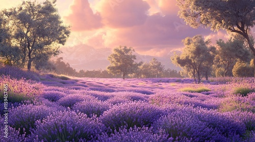 A serene lavender field under a colorful sky, surrounded by trees, creating a tranquil and picturesque landscape.