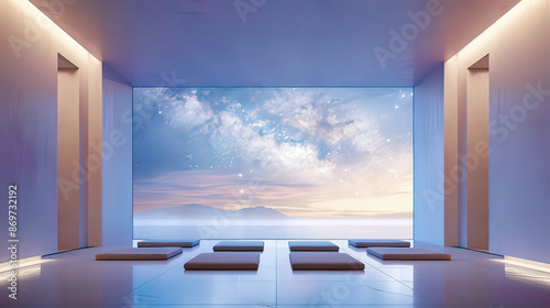 A serene meditation room with a large window revealing a starry sky, minimalist design with soft white lighting, hyper-realistic and ultra-detailed
