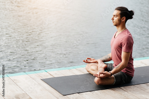 A serene moment captures a man engaged in meditation on a yoga mat beside tranquil waters. The peaceful setting enhances his focus and relaxation.