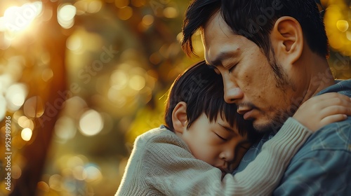 A serene moment of a father holding his sleeping child in a warm, golden-lit environment.