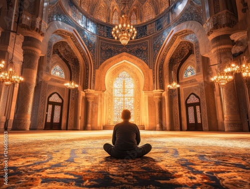 A serene moment of meditation inside a grand mosque, showcasing intricate architectural details, warm light filtering through ornate windows, creating a peaceful atmosphere