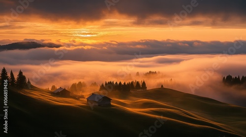 A serene moment on Velika Planina mountain plane at sunrise, capturing the calm before the day begins.