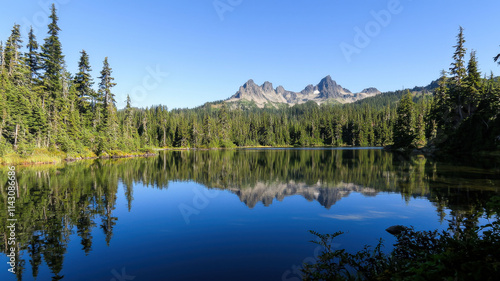 mountain landscape, evergreen tree, water reflection, blue skies, clearwater, scenic view, exploration, ecotourism