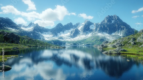 mountain, lake, sky, cloud, nature, scenery, landscape, calmness, beauty, water, greenery, outdoors, wilderness, peak, sunlight, serenity, environment, travel, adventure, exploration, photo, picturesque, flora, fauna, calm, peaceful, vibrant, summer, scenic, horizon, natural, ecosystem, remote, clear, blue, majestic, breathtaking, panoramic, view, hiking, terrain, wildlife, vista, relaxation, escape, journey, earth