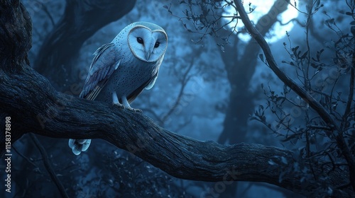 owl, tree branch, forest, moonlight, mist, wildlife, nature, nocturnal, serene, atmosphere, bird, tree, dark, blue, calm, mysterious, environment, habitat, eye, feather, perched, landscape, calmness, night, shadow, flora, fauna, beauty, stillness, elegance, silhouette, wilderness, scene, depth, quiet, observation, solitude, magic, aethereal, enchanting, photo, natural, twilight, dusk, peaceful, nocturne, ambience, scenery, whisper