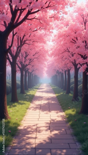 A serene pathway lined with blooming pink cherry blossom trees, inviting viewers into a tranquil and picturesque setting.