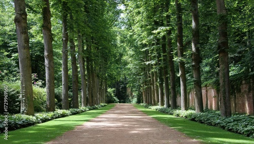 A serene pathway lined with tall trees, creating a tranquil and shaded garden walkway.