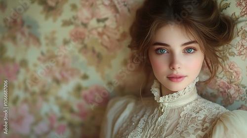 A serene portrait of a woman wearing an elegant Victorian dress, eyes gently gazing, with a soft smile illuminated by natural light. Background subtly featuring blurred Victorian wallpaper, hd detail,