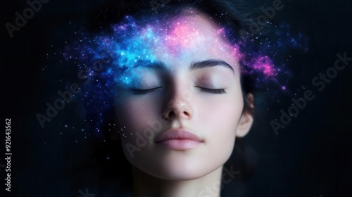 A serene portrait of a woman with a cosmic galaxy swirling above her head, reflecting dreams and the universe's beauty.
