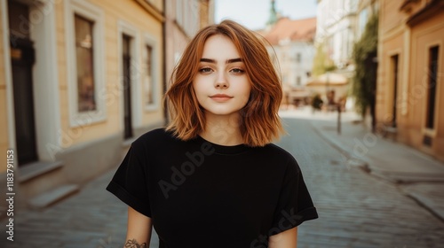 woman, portrait, street, city, girl, young, red, hair, fashion, model, beautiful, pretty, attractive, style, urban, scene, day, summer, casual attire, clothing, t-shirt, black, photo, photo, image, picture, look, expression, gaze, face, coiffure, bob, coiffure, person, people, human, poser