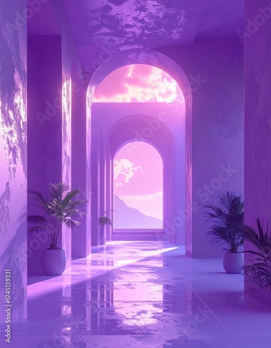 corridor, arch, purple, light, plant, visual, serene, escape, harmony, surreal, fantasy, dream, hallway, calmness, inspiration, peaceful, artistic, allure, shadow, ambience, high-coloured, perspective, contemporary, elegance, illusion, atmosphere, interior, depth, structure, space, modern, art, scene, journey, view, style, design, minimalism, decor, scenery, beauty, colours, aesthetic, nature, environment, architecture, landscape