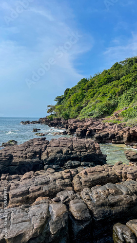 A serene rocky coastline with lush greenery under a clear blue sky, perfect for promoting eco-tourism and nature retreats