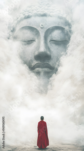 A serene scene where a monk in a vivid red robe stands with their back to the viewer, gazing up at a colossal, ethereal Buddha face that seems to form out of mist and smoke