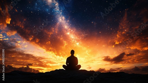 A serene silhouette of a person meditating against a vibrant sunset filled with stars and cosmic colors, evoking peace and tranquility.