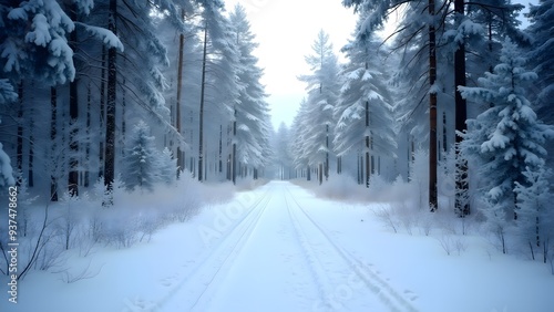 A serene snow-covered path through a dense forest of tall, snow-blanketed evergreen trees with tire tracks and footprints