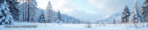 A serene snowy forest with bare branches and snow-clad pine trees against a pale blue sky, snowy landscape, forest scene, trees in winter