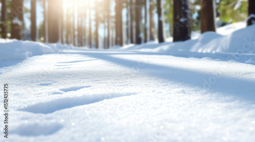 A serene snowy landscape with trees in the background, sunlight illuminating a peaceful winter scene.