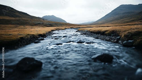 A serene stream winds through a valley, surrounded by rolling hills and a cloudy sky.