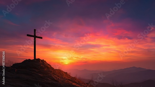A serene sunset scene featuring a cross on a rocky outcrop, with vibrant colors illuminating the sky and distant mountains.