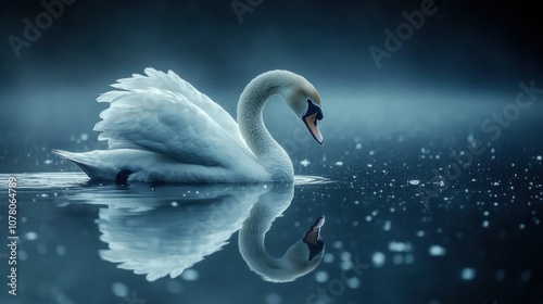 A serene swan glides gracefully on a misty lake, reflecting its elegance in the water.