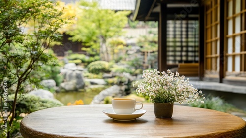 tea, cup, saucer, table, garden, flower, nature, calmness, relaxation, greenery, landscape, stone, water, duck pond, wooden, architecture, traditional, japanese, peaceful, decor, harmony, leisure, sunlight, pottery, rustic, calm, ambience, flora, fauna, aesthetic, zen, arrangement, simplicity, serenity, view, vibrant, season, culture, design, environment, home, space, balance, beauty, enjoyment, lifestyle, stillness, refreshment