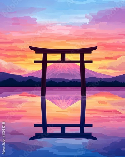 A serene torii gate reflection at sunset over tranquil waters with beautiful colors.