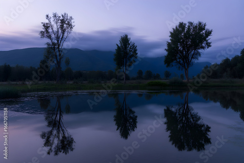 A serene, tranquil scene of three trees reflected in calm water against a backdrop of misty mountains at dusk, evoking peaceful contemplation