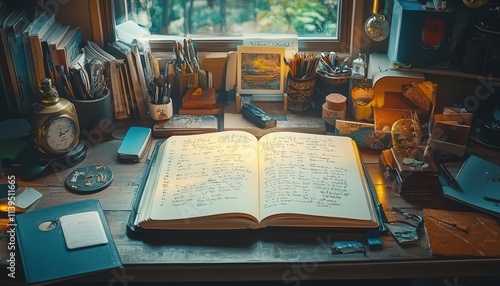 A serene travel journal with handwritten glowing entries, surrounded by scattered mementos on a sunny desk