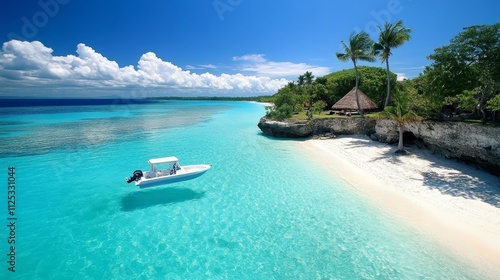 A serene tropical beach with clear turquoise water, a boat, and lush greenery under a bright sky.